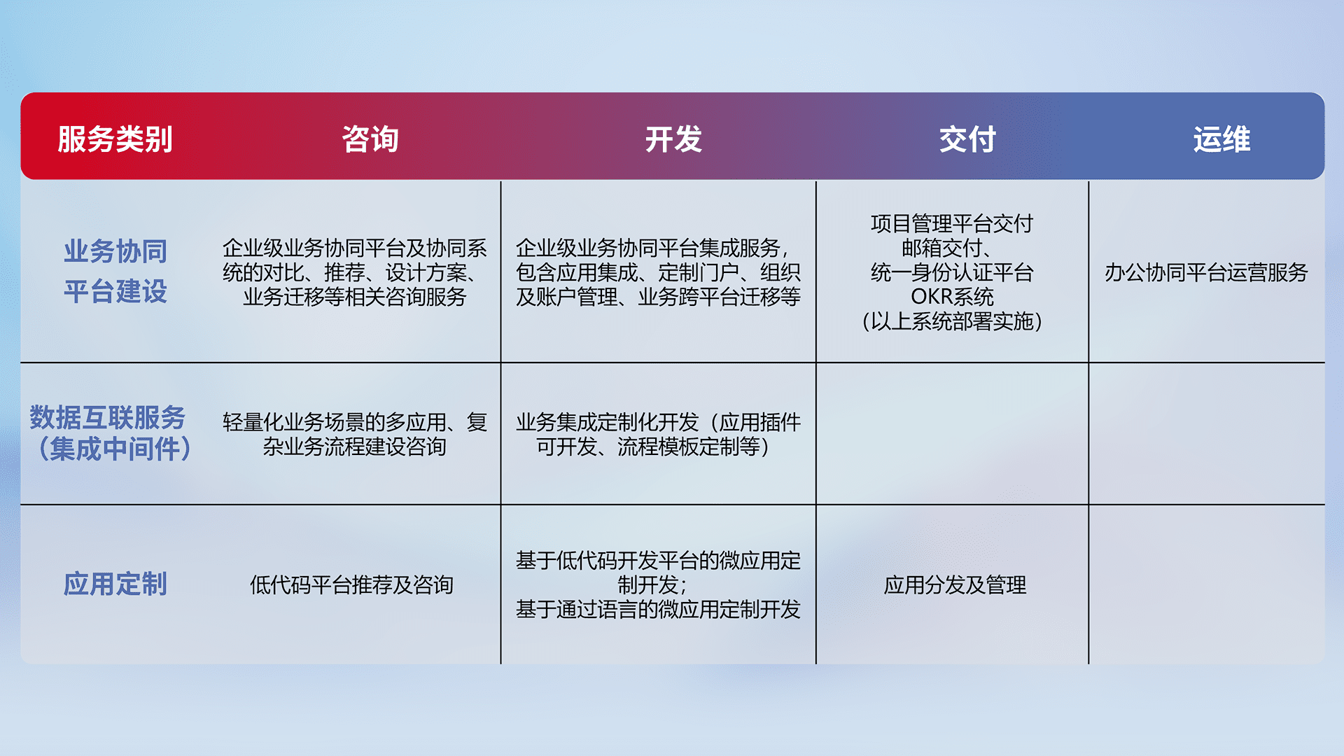 针对钉钉、、企微、、、IDaas等平台级产品提供产品的规划、、方案、、、、交付、、定制化开发等服务,,,,实现如统一协同办公、、、、智能客户服务、、、、混合会议管理、、、、智能数据查询、、等业务场景,,,,实现数字化转型。。。