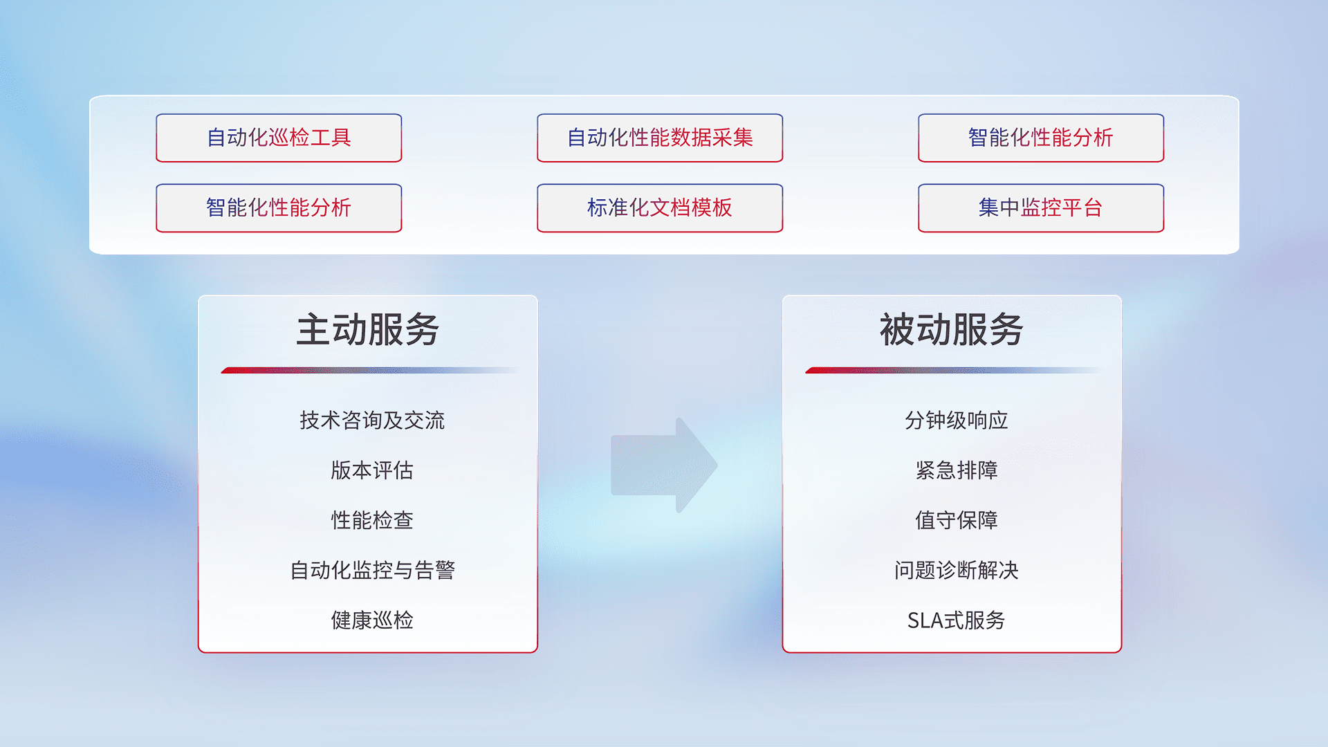 智能化工具和标准化文档,,,保障服务质量,,,,提供主动服务(包含技术咨询、、版本评估、、、、性能检查、、自动化监控与告警、、、、健康巡检)和被动服务包含(分钟级响应、、、紧急排障、、、、值守保障、、、、问题诊断解决、、、SLA服务)。。。。